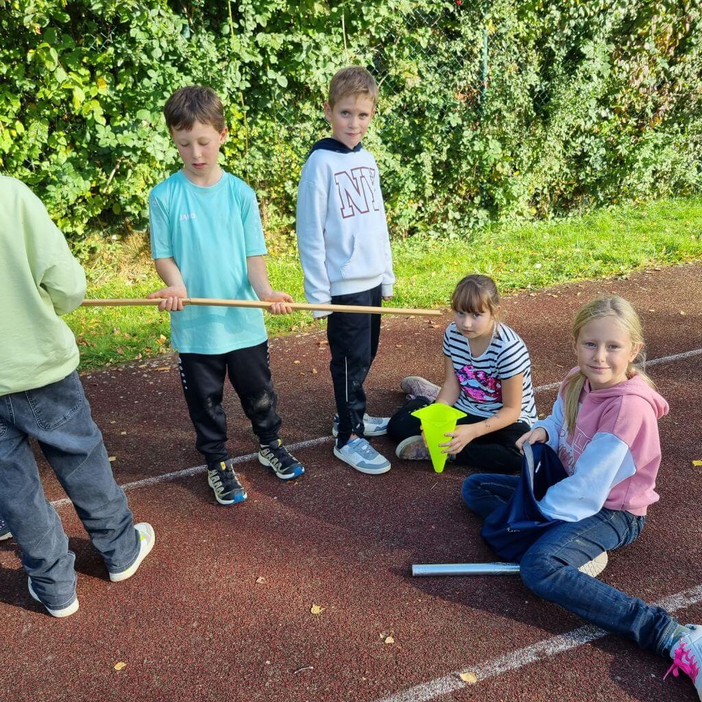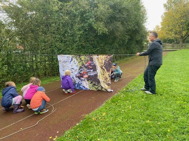 Der Nachmittag gehörte dann den Klassen 3 und 4. Unter anderem sollten die Schülerinnen und Schüler mit Schnüren und einem Kreisel eine Sonne auf ein Papier zeichnen oder einen Salzsäuresee auf Klötzen durchqueren. Bei allen Spielen handelte es sich um Vertrauens- und Kooperationsspiele. Man benötigte das gesamte Team, um das Ziel zu erreichen.